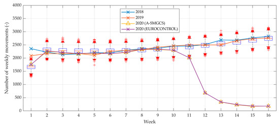 Estimated weekly business-as-usual numbers of aircraft movements and weekly real numbers of aircraft movements at LKPR in 2018, 2019 and 2020 (according to A-SMGCS and EUROCONTROL [43]) (weeks 1–16).