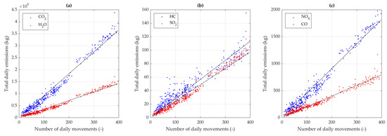 Figure 7 shows the total daily emissions plotted against the corresponding number of daily movements for each emission species separately. Linear regression using the least squares method was performed, with the resulting regression lines included in the plots. The purpose of the regression was to estimate the emission factors (slopes of the lines) that are listed in Table 3. As explained earlier, these emission factors were used to estimate the business-as-usual daily aircraft LTO emissions by multiplying their values with the daily number of movements (while also accounting for the uncertainty or the “stochastic” emissions). Corresponding R squared values, ranging from 0.904 to 0.977, are available in the same table.