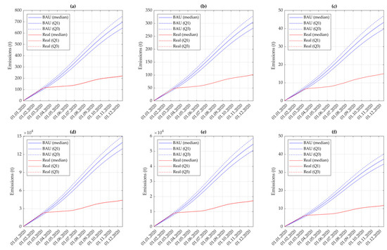 Figure 11 shows the plotted cumulative LTO aircraft emissions (real and estimated business-as-usual) for each emission species. Specifically, the cumulative sums of the first and third quartiles (Q1 and Q3, respectively) and the second quartile (i.e., median) are plotted. These quartiles were based on the 10,000 iterations over which the total daily business-as-usual emissions were estimated. The effect of the COVID-19 pandemic on aircraft LTO emissions at LKPR throughout 2020 can thus be observed as the difference between two corresponding curves (e.g., those representing medians). As can be seen for all emission species, the sums began diverging in mid-March 2020, which is consistent with other previously presented results. It should also be noted that the quartiles for the real emissions were very similar, which explains the significant overlap of the red curves and thus the seemingly single red curve in the plots.