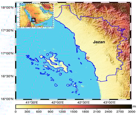Regional elevation map (inset) with Jazan province in southwest Saudi Arabia. The red star indicates the location of the surface observation station at Jazan (42.58° E and 16.90° N, ICAO code OEGN, WMO code 41140). The Farasan Islands are a small group of coral islands ~40 km off the coast of Jazan in the Red Sea.