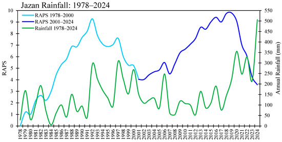 Annual rainfall (mm) with RAPS for the period 1978–2024.