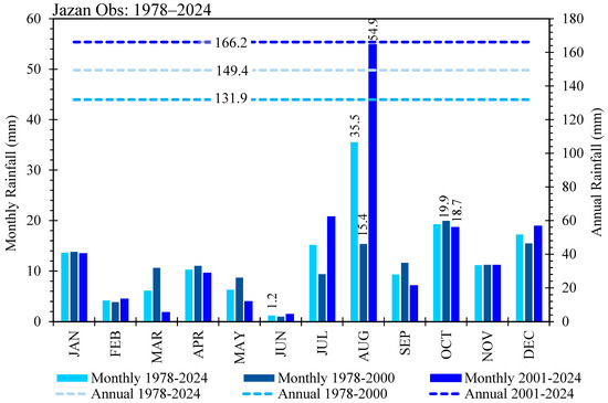 Observational rainfall at the Jazan meteorological station for the available period 1978–2024 indicates an interannual variation ranging from the lowest, at 5.2 mm (in 1984), to the highest, at 505.9 mm (in 2024). The RAPS analysis indicates that the time series has two phases or cycles (Figure 2). The two phases in the annual rainfall belong to two time slots: one for recent decades (2001–2024) and the other for previous decades (1978–2000). Observational rainfall at the Jazan meteorological station averaged over the period from 1978 to 2024 shows that the annual rainfall was 149.4 mm, with a monthly peak of 35.5 mm occurring in August and a low of just 1.2 mm in June (Figure 3). In recent decades, the annual average rainfall increased to 166.2 mm, compared to 131.9 mm in the earlier period, indicating a total increase of 34.3 mm. Notably, the recent peak rainfall recorded in August was 54.9 mm, while the previous peak in October was only 19.9 mm. Hence, the August rainfall increased from 15.4 mm to 54.9 mm, while the October rainfall decreased from 19.9 mm to 18.7 mm in recent decades. This shift indicates a clear transition of the rainfall peak from autumn to summer, especially from October to August in the Jazan region. The October rainfall peak (~19 mm) in Jazan for the period 1970–2003 was also reported [19]. There was a significant increase in rainfall during July, August, and December and a notable decrease in March, May, and September, with minimal changes in the remaining months. The significant increase in rainfall during July and August is in line with the possibility of the reported [20] large increase in the Jazan rainfall.