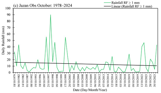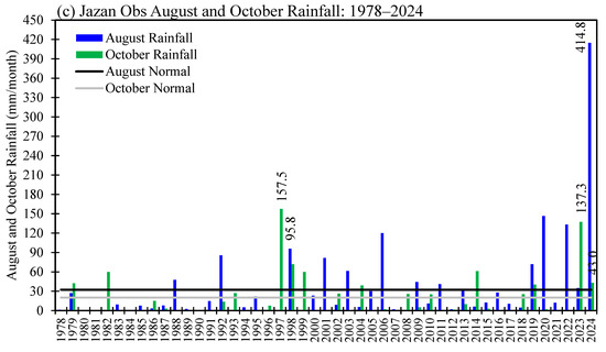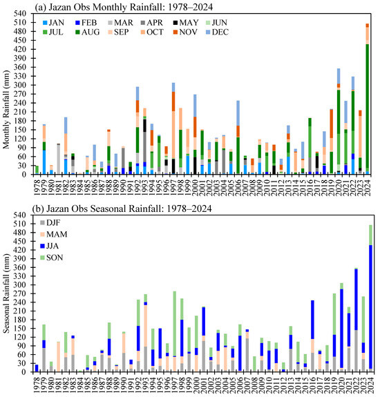 Figure 4 exhibits the temporal patterns of monthly, seasonal, and annual rainfall in the Jazan region, highlighting both intra- and inter-annual variations. The full bar indicates the annual total rainfall in each year including different months (Figure 4a) and seasons (Figure 4b). As mentioned earlier, the average annual rainfall for Jazan is 149.7 mm, with notable peaks in 1979 (168.7 mm), 1982 (192.14 mm), 1992 (294.3 mm), 1997 (307.8 mm), 2000 (268.8 mm), 2006 (248.0 mm), 2016 (189.8 mm), 2019 (220.2 mm), 2020 (355.5 mm), 2022 (328.7 mm), and 2024 (493.9 mm). This indicates a clear increase in annual rainfall over the recent decade, growing at a rate of 92.9 (Mann Kendall 34.1) mm/decade, compared to 74.3 (Mann Kendall 38.3) mm/decade in the previous decade. Overall, the rate of increase in annual rainfall for the entire period was 31.8 (Mann Kendall 26.5) mm/decade. This is in line with the positive trend of Jazan rainfall for the period 1970–2003 [19]. All trends are significant at the 95% confidence level. While the rainfall was increasing in most months, decreases were observed in January, March, April, and September.