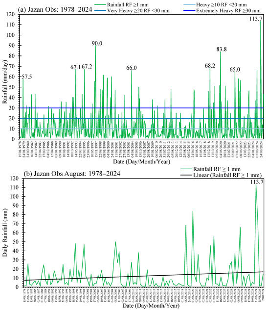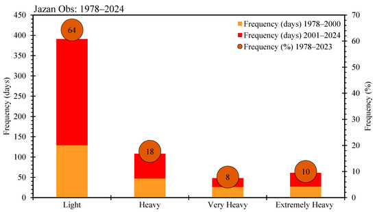 During the study period from 1978 to 2024, the highest daily rainfall recorded was 113.7 mm on 23 August 2024, followed by 90.0 mm on 22 October 1997 and 83.8 mm on 3 August 2020 (Figure 5a). The threshold for each category indicates that in the region, heavy to extremely heavy rainfall occurred, which was more frequent in the 1990s and 2010s. There has been a significant increase in wet days (rainfall ≥ 1 mm/day) daily rainfall in the Jazan region in August and a decrease in October (Figure 5b,c). The daily rainfall insignificant increase rate in August was ~0.68 (Mann Kendall 0.45) mm per day per decade, whereas its insignificant decrease rate in October was ~0.79 (Mann Kendall −0.68) mm per day per decade. At Jazan station, a total of 608 wet days were recorded from 1978 to 2024 (Figure 5a and Figure 6). Among these, light, heavy, very heavy, and extremely heavy rainfall days accounted for 391 (64% of wet days), 108 (18%), 48 (8%), and 61 (10%), respectively (Figure 6). Thus, there were a total of 216 days (36%) classified as heavy to extremely heavy rainfall days during the study period, while the remaining 64% were light rainfall days. This means that heavy to extremely heavy rainfall days occur approximately 6 days per year, while light rainfall days occur about 10 days annually. In recent decades (2001–2024), the frequency of light, heavy, and extremely heavy rainfall days increased by 133, 13, and 7 days, respectively, while the number of very heavy rainfall days decreased by 4 days compared to the previous decades (1978–2000).