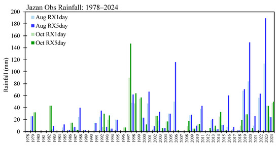 Time sequences of annual maximum amount of rainfall in 1 day (RX1day) and maximum amount of rainfall in 5 consecutive days (RX5day) for August and October obtained from observations at Jazan station for the period 1978–2024.