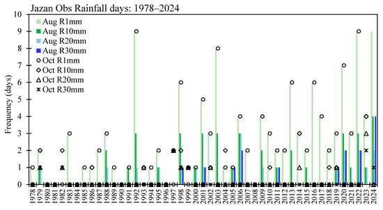 On average, the frequency of rainy, heavy, very heavy, and extremely heavy rainfall days in August (October) for the recent decades is 3.9 (1.5), 1.2 (0.5), 0.6 (0.3), and 0.6 (0.1) days, respectively. This indicates that the rainfall in Jazan is primarily due to wet days, with additional contributions from heavy rainfall. Furthermore, there has been a notably larger number of rainy days in August compared to October in recent decades. Notably, August 2024 recorded an unprecedented total of 19 rainy days, while in October 2024, it was only one. Overall, the rainfall activity in August has been more pronounced than in October in recent decades.