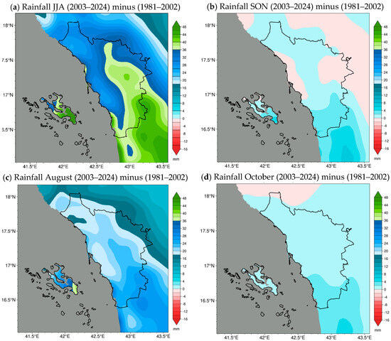 Spatial distribution of changes in seasonal rainfall in and around Jazan region obtained from CHIRPS reanalysis datasets for the period 1981–2024. Changes in rainfall are the average of 2003–2024 minus the average of 1981–2002 for (a) summer, (b) autumn, (c) August, and (d) October.