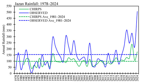 Time sequences of annual rainfall in Jazan region obtained from observations for the period 1978–2024 and CHIRPS reanalysis datasets for the period 1981–2024. The dashed lines represent the average rainfall for the common period 1981–2024.
