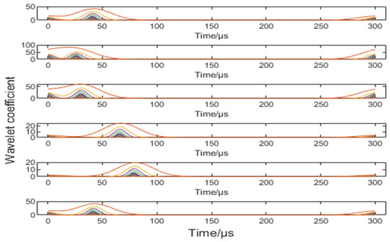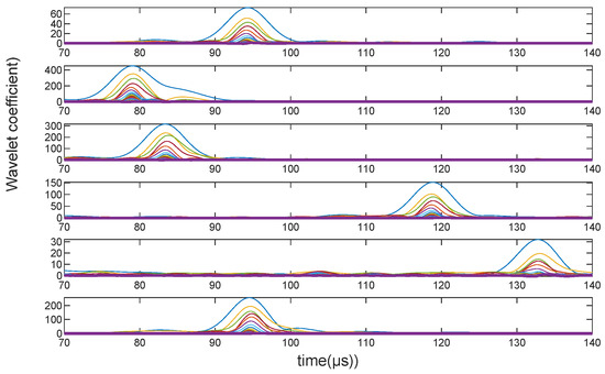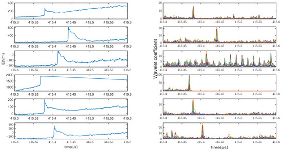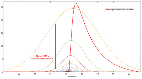 The chromatic dispersion during the propagation of the LEMP waveform will result in the deceleration of the leading edge of the detected waveform, leading to an inaccurate peak arrival time. Figure 1 depicts the continuous wavelet transform of an original LEMP waveform within the range from 100 kHz to 2.5 MHz with an interval of 100 kHz. As the wavelet frequency increases, the wavelet coefficient curves at each frequency point gradually become sharper, the peak point position gradually shifts forward, and it becomes significantly dissimilar from the peak time of the pulse time-domain waveform.