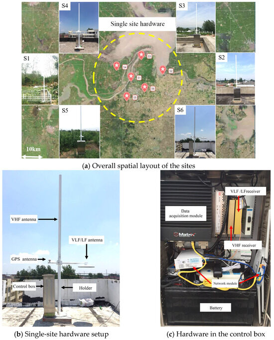 Each detection site is composed of a VHF antenna, VLF/LF antenna, global positioning system (GPS) antenna, data acquisition module, and network module. The operating mode of the system is similar to that of the Chongqing site network [17,18]. The VHF module and VLF/LF module measure the vertical electric field generated by lightning radiation signals in different frequency bands, respectively.