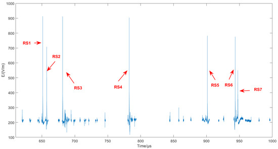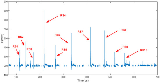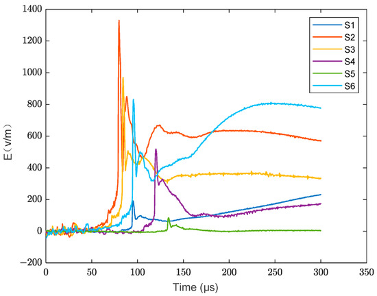 The peak value method and the CWT method were employed to analyze a dataset of an artificially triggered lightning containing seven return strokes. Due to the ineffective triggering at the detection site S3, data from the remaining six sites were utilized for the analysis. The waveform of the data collected by site S2 is presented in Figure 16.