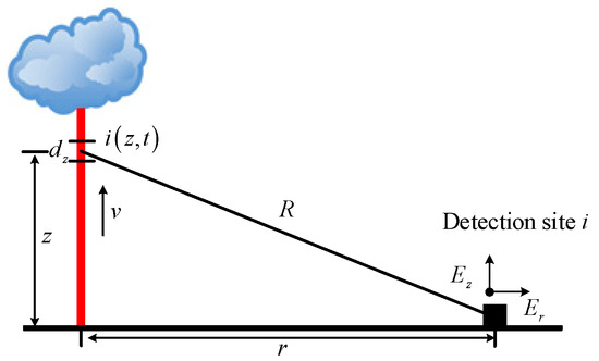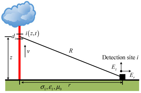 r represents the horizontal distance from the radiation source to the detection site, while z denotes the height of the radiation source. Additionally, represents the distance between the radiation source and the detection site. c denotes the propagation speed of electromagnetic waves, which is equivalent to the speed of light. The height of the discharge channel is set at H = 3 km, with a maximum propagation time of t = 300 μs.