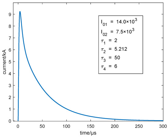 The current parameters are as follows: I01 = 11 kA, I02 = 7.5 kA, τ1 = 0.2 μs, τ2 = 5.212 μs, τ3 = 100 μs, and τ4 = 6 μs. Figure 5 shows the current profile defined by these parameters.