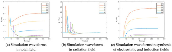 As illustrated in Equation (8), the total field comprises three components: the electrostatic field, the induction field, and the radiation field. Taking into account the attenuation of LEMP during propagation, it is evident that the electrostatic and induction field components exert a significant influence at close range, whereas the radiation field component becomes predominant at greater distances. The low-frequency characteristics of the slowly varying electrostatic and induction fields (as depicted in Figure 7c) lead to a lack of distinct pulsatile behavior, complicating direct and accurate extraction of lightning arrival times. Consequently, for lightning TOA positioning, either the total field (as depicted in Figure 7a) or the radiation field (as depicted in Figure 7b) is typically employed.