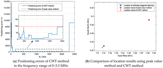 Upon comparing the positioning outcomes derived from the simulated data and the measured data through the CWT method, it can be perceived that the positioning effect is generally satisfactory within the frequency range of 1~2 MHz, which is notably superior to the peak method. Consequently, it can be inferred that for the typical pulse waveform of LEMP, this frequency band within the range can be chosen as the wavelet frequency for the CWT method. The sampling rate of both types of data is 5 MHz. According to Shannon’s sampling theorem, the upper limit of the effective frequency of the useful component is 2.5 MHz. Hence, 50~80% of this value (e.g., 1~2 MHz) can be selected as the wavelet frequency to achieve high-precision lightning positioning results.