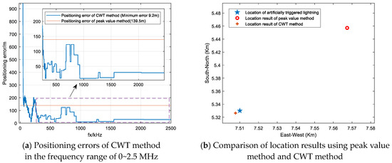 To further validate the effectiveness of the proposed method, we analyzed two datasets: one consisting of artificially triggered lightning with seven return strokes and another comprising real CG lightning flash with ten return strokes. The results confirmed that the CWT method exhibits significantly higher positioning accuracy compared to the traditional peak value method. Typically, the wavelet frequency should be set between 25% and 40% of the data acquisition system’s sampling rate. For instance, in the system described herein, which has a sampling rate of 5 MHz, a wavelet frequency range of 1 to 2 MHz yields optimal positioning performance.