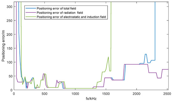 The disparity in the positioning efficacy of the three components lies in the inconsistent effective frequency range: the radiation field exhibits a favorable positioning effect across almost the entire frequency range (40–2.5 MHz); the total field demonstrates a good effect within the frequency range of 80–2.3 MHz; while the effective frequency range of synthesis of electrostatic and induction fields is the narrowest, and it can merely achieve positioning within the frequency range of 140 kHz~1.5 MHz. According to Formula (7), the wavelet function compresses more at relatively higher frequencies, the compression scale of the wavelet function increases, leading to a more pronounced sharpness in the waveform of the wavelet basis function. However, as illustrated in Figure 7c, the synthesis waveform of the electrostatic and induced fields is relatively smooth, lacking distinct peak features. Consequently, in the high-frequency band, the similarity between this waveform and the wavelet basis function is reduced, resulting in less prominent peaks in the wavelet coefficient curve, which may cause Equation (5) to be unable to obtain precise results, leading to significant positioning errors.