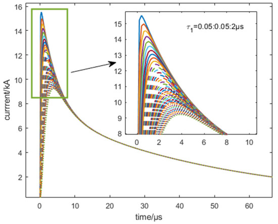 In order to modify the profile of the lightning current waveform, 40 distinct τ1 values were selected from the range of 0.05–2 μs, resulting in 40 current pulse waveforms characterized by varying degrees of sharpness at both the leading edge and peak, as illustrated in Figure 13, the pulse peak values from top to bottom correspond respectively to τ1 values ranging from 0.05 μs to 0.2 μs.