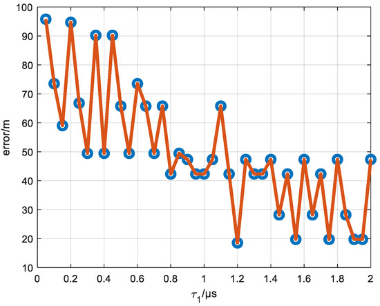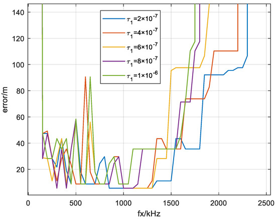 The current waveforms of five sets of simulated data were located by the CWT method, and the error curves within the 0~2.5 MHz frequency range are depicted in Figure 15. It is conspicuously observable that as τ1 increases, the upper limit of the frequency band capable of being effectively localized also escalates. Within the range of 750 kHz~1.5 MHz, the position error lies between 5.60 and 29.63 m, which is significantly superior to that of the peak method (42.33–95.78 m).