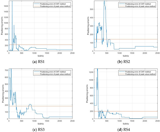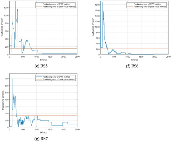 Using the peak value of the envelope as the arrival time of waves at each frequency point, positioning results are obtained. The positioning errors corresponding to different frequency points are illustrated in Figure 11. The positioning error of the peak value method amounts to 139.5 m in the measured data. Within most of the analyzed frequency bands (300 kHz:100 kHz:2.5 MHz), the horizontal positioning error of the CWT method is conspicuously lower than that of the peak value method, with the minimum positioning error being 9.2 m.