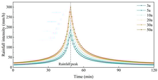 Considering the requirements outlined in the National Standard of the People’s Republic of China—Outdoor Drainage Design Standard (GB 50014-2021), which specifies a rainfall return period of 2–3 years for the design of stormwater pipelines in the central areas of medium and small cities, a 3-year return period was selected as the minimum rainfall intensity in this study. Accordingly, six rainfall scenarios were designed with return periods of P = 3, 5, 10, 20, 30, and 50 years. The rainfall duration for all scenarios was set to 120 min, with a rainfall peak coefficient of 0.4. The temporal distribution of the designed rainfall scenarios is shown in Figure 2.