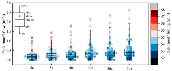 Peak runoff, representing the maximum surface runoff during a rainfall event, reflects the greatest stress imposed on the drainage system. Figure 4 illustrates the magnitude and corresponding timing of peak runoff under six different rainfall return periods. The range of peak runoff flow for return periods of 3, 5, 10, 20, 30, and 50 years is 0.008–1.251 m3/s, 0.009–1.493 m3/s, 0.012–1.827 m3/s, 0.014–2.167 m3/s, 0.016–2.368 m3/s, and 0.018–2.622 m3/s, respectively. Similar to the pattern of total surface runoff, the variability of peak runoff increases with rainfall intensity.