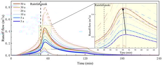 Additionally, the results indicate that in most areas, the peak runoff timing is concentrated between 52 and 55 min after the onset of rainfall, whereas regions with higher peak runoff volumes tend to experience peak runoff after 55 min. However, as rainfall intensity increases, the peak runoff timing shifts earlier, a trend that is particularly pronounced in areas with greater runoff accumulation. Figure 5 presents the overall surface runoff curve for the study area, demonstrating a lag between surface runoff peaks and rainfall peaks. As the rainfall intensity increases, the surface runoff peak advances by approximately 1 min. While this shift may appear minor, it has practical implications for urban flood management. A 1 min reduction in response time could place additional stress on the drainage infrastructure, potentially leading to earlier and more frequent system overflows. Moreover, for emergency flood mitigation measures, even a slight acceleration in peak runoff could reduce the available time for interventions, necessitating a proactive approach to drainage planning and urban resilience strategies.