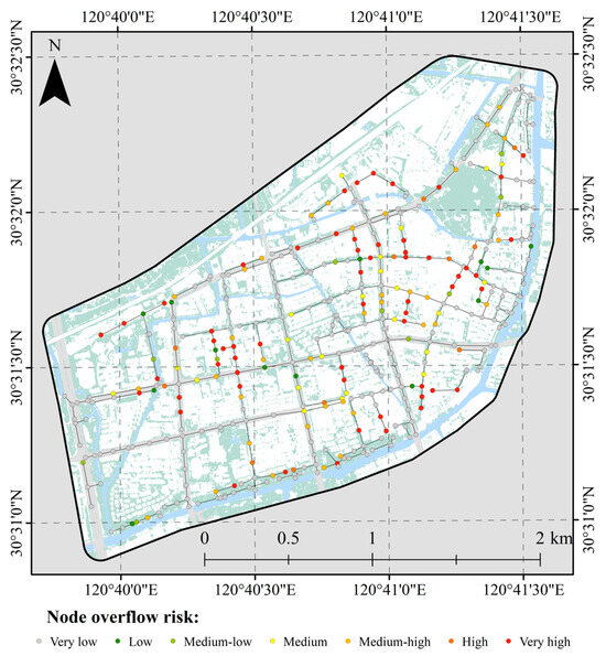 Node overflow risk map: very high risk represents nodes where overflow volumes exceed 100 m3, even under the 3-year return period, while very low risk corresponds to nodes that have never experienced overflow under any scenario.