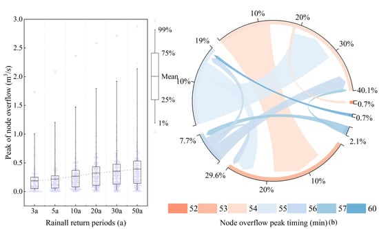 Based upon the simulation results, the overflow curves for all nodes under six rainfall return periods were analyzed, and peak overflow values and peak overflow times were extracted, as shown in Figure 7. The ranges of peak overflow for the 3-year, 5-year, 10-year, 20-year, 30-year, and 50-year rainfall return periods were 0.001–1.733 m3/s, 0.001–2.085 m3/s, 0.004–2.358 m3/s, 0.004–2.589 m3/s, 0.004–2.716 m3/s, and 0.004–2.872 m3/s, respectively.