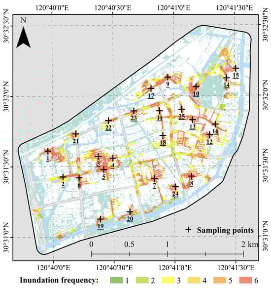 To identify high-risk flooding areas within the study region, 25 sampling points were selected based on model-simulated surface inundation results. These points represent the centers of inundation and were chosen to ensure comprehensive coverage of flood-prone locations. Notably, all selected points experienced inundation under the 3-year rainfall return period, making them representative of persistent flooding hotspots. Figure 8 illustrates the spatial distribution of these sampling points. To quantify flood risk, we define inundation frequency as the number of rainfall scenarios (out of the six simulated return periods) in which the inundation depth at a given point exceeds 15 cm. This threshold is derived from the Standard for Design of Outdoor Wastewater Engineering (GB50014-2021) in China, which considers inundation depths greater than 15 cm to have adverse effects on urban operations. Based on inundation frequency, we established a risk classification system: a rating of 6 indicates that inundation depths exceeded 15 cm in all six rainfall scenarios, while ratings of 5, 4, 3, 2, and 1 correspond to the number of scenarios in which this threshold was surpassed. Higher risk levels highlight locations requiring targeted flood mitigation strategies to enhance urban resilience and adaptive capacity.