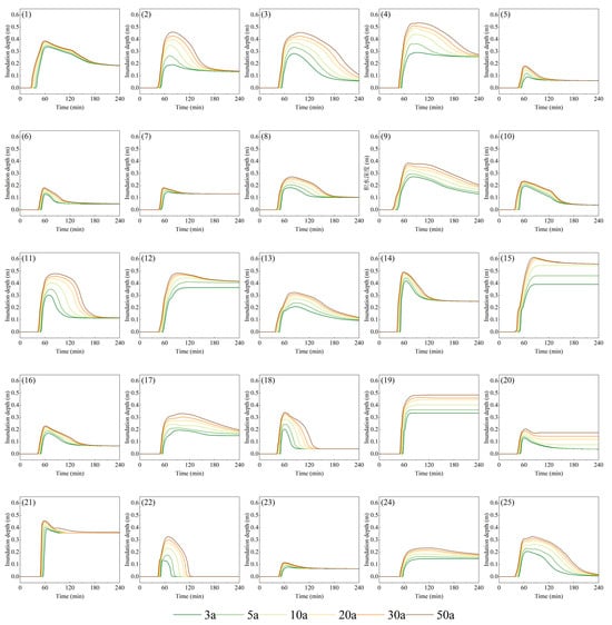 Inundation process curves for the sampling points. Numbers 1–25 correspond to the sampling points used for inundation analysis. The curves represent the temporal changes in inundation depth at various sampling points across the study area under six different rainfall return periods. Each plot corresponds to a specific sampling point, with the color coding in the legend indicating the return period: 3-year, 5-year, 10-year, 20-year, 30-year, and 50-year.