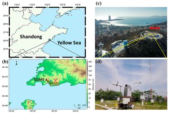 (a) Map of Shandong Province, China, adjacent to the Yellow Sea. (b) Locations of QDMS (black triangle) and BGMS (red circle), along with the surrounding topography. The color shading represents the elevation of the terrain. (c) Photograph of the BGMS observation site and (d) the instrument setup.