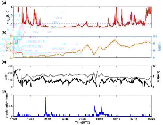 Temporal evolution of (a) the observed Vis (Visob, in km) from BGMS, (b) Ta (in °C) and RH (in %), (c) wind direction (in °) and wind speed (in m s−1), and (d) precipitation (in mm) from 1700 UTC 27 June to 0920 UTC 28 June 2022.