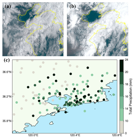 (a,b) display visible satellite imagery from the Himawari-8 satellite (Source: https://www.eorc.jaxa.jp/ptree/index.html (accessed on 11 December 2024)). (a) 0000 UTC on 28 June and (b) 0300 UTC on 28 June. (c) Scatter plot of cumulative precipitation (in mm) from automatic weather stations near BGMS throughout the fog process.