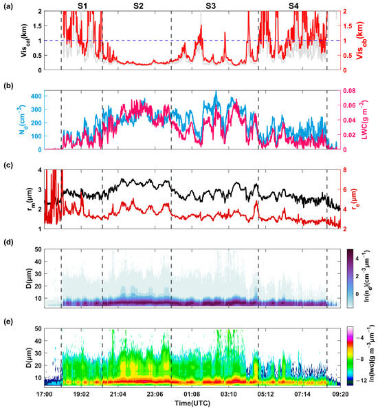 Temporal evolution of Vis and microphysical character. (a) The observed Vis (red line) and calculated Vis based on 1 min average fog DSD data (grey line), (b) the 1 min average Nd (blue line) and LWC (red line), (c) the 1 min average rm (black line) and re (red line), (d) the 1 min average Nd spectrum, and (e) the 1 min average LWC spectrum. The labels S1 to S4 at the top of the figure indicate the four stages of the fog process: formation, development, maturity, and dissipation.