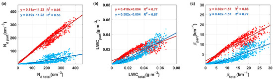 (a) The 1 min average Nd of small droplets (red dots) and large droplets (blue dots) as a function of total Nd, (b) the 1 min average LWC of small droplets (red dots) and large droplets (blue dots) as a function of total LWC, and (c) the 1 min average βext of small droplets (red dots) and large droplets (blue dots) as a function of total βext.