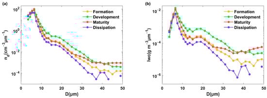 The mean fog DSD at different stages of the fog process. (a) Nd spectrum distribution and (b) LWC spectrum distribution. The average spectrum is calculated using data with Vis below 1 km.