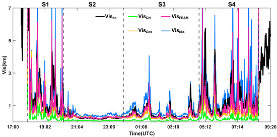 Temporal evolution of visibility (solid line, in m) from BGMS during the sea fog event from 1756 UTC 27 June to 0835 UTC 28 June 2022. Visob is the observed Vis. VisGex is obtained from Equation (13); VisGN, Visk84, and VisFRAM are obtained from Table 3. The labels S1 to S4 at the top of the figure indicate the four stages of the fog process: formation, development, maturity, and dissipation.