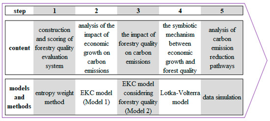 In order to understand the impact mechanism of forestry quality factors on EKC in China and explore effective carbon-reduction pathways, this paper constructs an EKC model considering forestry quality. The Lotka–Volterra model was introduced into the analysis of the symbiotic mechanism between economic growth and forestry land quality, and the forestry quality EKC and symbiotic mechanism model were used to compensate for the shortcomings of existing research. The research process is shown in Figure 1:
