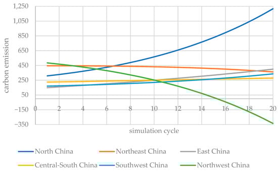 The simulation data in Table 9 show that the northeast and northwest regions achieved a gradual reduction in carbon emissions during the simulation period, making them the regions with the best carbon neutrality effect among all geographical regions. The carbon emission reduction effect is highest in the northwest region, indicating that the unit emission reduction intensity of forest quality in the northwest region is relatively high. The carbon emissions levels in the central southern, southwestern, and northeastern regions are similar and all at relatively low levels. Figure 2 shows the trend of carbon emissions.