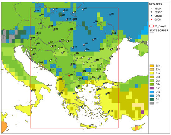 Data from 12 stations of the national meteorological network of Bulgaria are provided by the National Institute of Meteorology and Hydrology (NIMH). Data from stations outside Bulgaria were downloaded from three freely available sources: the European Climate Assessment and Dataset (ECA&D) project [62], the U.S. National Climatic Data Center (NCDC) Global Historical Climatology Network daily dataset (GHCNd) [63] and the U.S. National Centers for Environmental Information (NCEI) Global Surface Summary of the Day (GSOD) dataset [64]. Most stations have altitudes below 500 m and are distributed across four Köppen–Geiger climate zones [60]—Cfa (25%), Cfb (34%), Csa (21%) and Dfb (20%). The stations’ metadata are presented in Appendix A, Table A1.