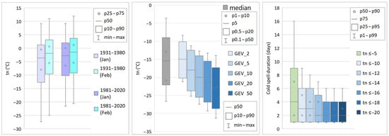 (Left panel): Medians of calculated percentiles of tn-distributions by stations for 1931–1980 and 1981–2020. (Middle panel): Median of calculated lower percentiles of tn-distributions and 2-, 5-, 10-, 20- and 50-year return levels (estimated by GEV model) by stations for yearly minima (1931–1980). (Right panel): Box plot of distributions of cold spells duration at the different tn-thresholds for 1961–2020. The BG36 dataset was used for all calculations.
