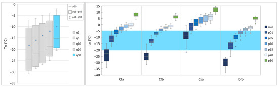 (Left panel): Distribution of calculated empirical quantiles (q2 to q50) on time series of annual minimum temperatures (Tn) for 1961–2020 by stations across SEE; (Right panel): Medians (p50); 20th, 15th, 10th, 5th and 1st percentiles (p20, p15, p10, p05 and p01) and absolute minima (min) of daily minimum temperature (tn) for 1961–2020 by climate zones; the range of values used in threshold indicators is shown in bright blue.