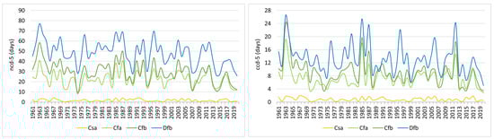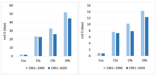 Figure 5 compares the multiyear means of ncd-5 and ccd-5 for 1961–1990 and 1991–2020. The number of cold days decreased during the second period by 14% and 21% in the Dfb and Cfb climate zones, respectively, but there was no substantial change in the Cfa and Csa zones. The most significant change in ccd-5, both in absolute terms (−2.4 days) and as a percentage change (−24%), was registered in the Cfb climate zone.
