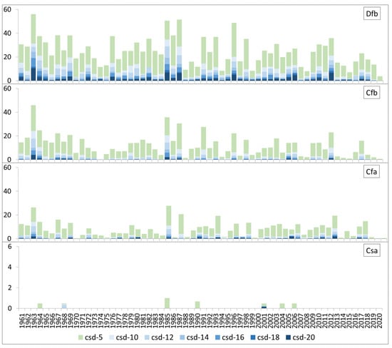 Figure 6 presents the evolution of the cold spell duration indicator (csd) by categories, averaged by climate zones. The highest values for csd-5 were reached in 1963 (Dfb and Cfb) and 1985 (Cfa and Csa). The csd indicator distinguished the severity of extreme cold weather well in most of the SEE domain and marked some extremely severe cold events in the Csa climate zone, such as in 1968, 1985 and 2001 [85,86]. The calculated average trend magnitudes decreased with the csd category increasing, varying from −2.7 to −0.2 days/10 years in Dfb and from −1.7 to −0.3 days/10 years in Cfb climate zone (Table 2).