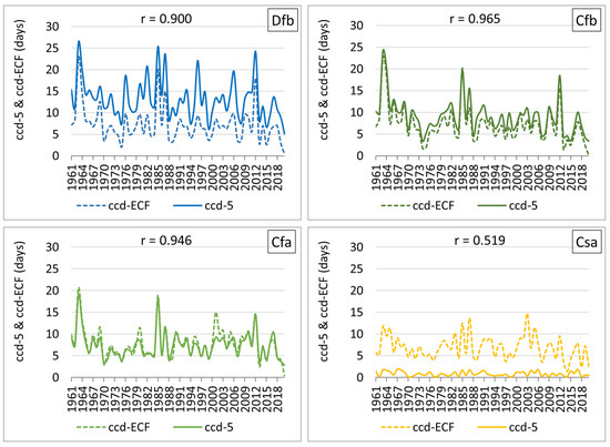 Long-term variations of ccd-5 and ccd-ECF (unit: days) averaged by Köppen–Geiger climate zones; r denotes the Pearson’s correlation coefficient.