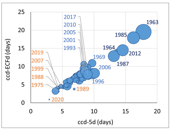 Scatter plot of ccd-ECFd vs. ccd-5d. The size of the bubbles is proportional to the yearly maxima of ECFsev calculated by stations and averaged over the SEE domain. Several years by each severity category are shown in different font colors: orange for mild, light blue for severe and dark blue for significantly more severe winters.