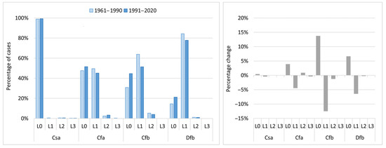 (Left panel): Mean ECFsev across SEE by severity levels for 1961–1990 and 1991–2020 by climate zones; (Right panel): Percentage change in the mean ECFsev for 1991–2020L1–L3 denote severity levels, as defined in [80]; L0—no excess cold.