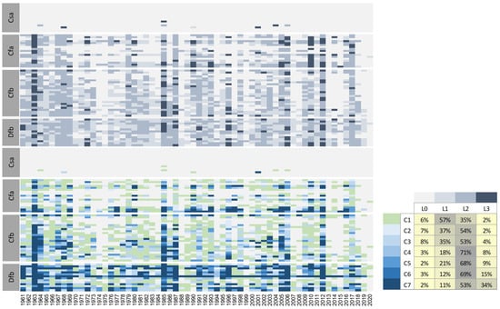 The detailed comparison between yearly maxima of csd categories (denoted by C1 to C7) and ECFsev levels demonstrated good spatio-temporal conformity, as seen in the left panel of Figure 10. The relationship between the categories and severity levels is complex, but the data indicate that categories C4 to C6 are more closely associated with L2. In contrast, the other categories are fuzzified between neighbor ECFsev levels: the C1 category mainly corresponds to L1, and over 30% of cases in the C7 category align with L3 (Figure 10, right panel).