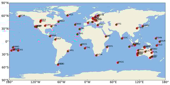 These stations are equipped with JAVAD, LEICA, SEPT, STONEX, and TRIMBLE receivers. There are 10 JAVAD receivers, which are controlled by firmware versions JAVAD TRE_3S, JAVAD TRE_3, and JAVAD TRE_3 DELTA. There are 2 LEICA receivers; 1 is controlled by firmware version LEICA GR30, and the other is controlled by LEICA GR50. There are 34 SEPT receivers, which are controlled by firmware versions SEPT POLARX5, SEPT POLARX5TR, SEPT POLARX5S, and SEPT ASTERX4. Only 1 station operates a STONEX receiver, the firmware version of which is STONEX SC2200. Finally, there are 13 TRIMBLE receivers, which are controlled by firmware version TRIMBLE ALLOY. The detailed information of the 60 MGEX tracking stations is shown in Table 2. Please refer to Appendix A for the detailed performance of all receivers.